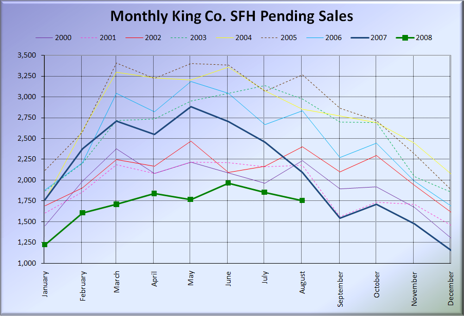 It looks like we may have finally found the plateau for King County SFH inventory right around the 12,000 mark. I suspect we’ll stay above 2007 levels for a few months more, but may fall down close to last year’s inventory in the winter.